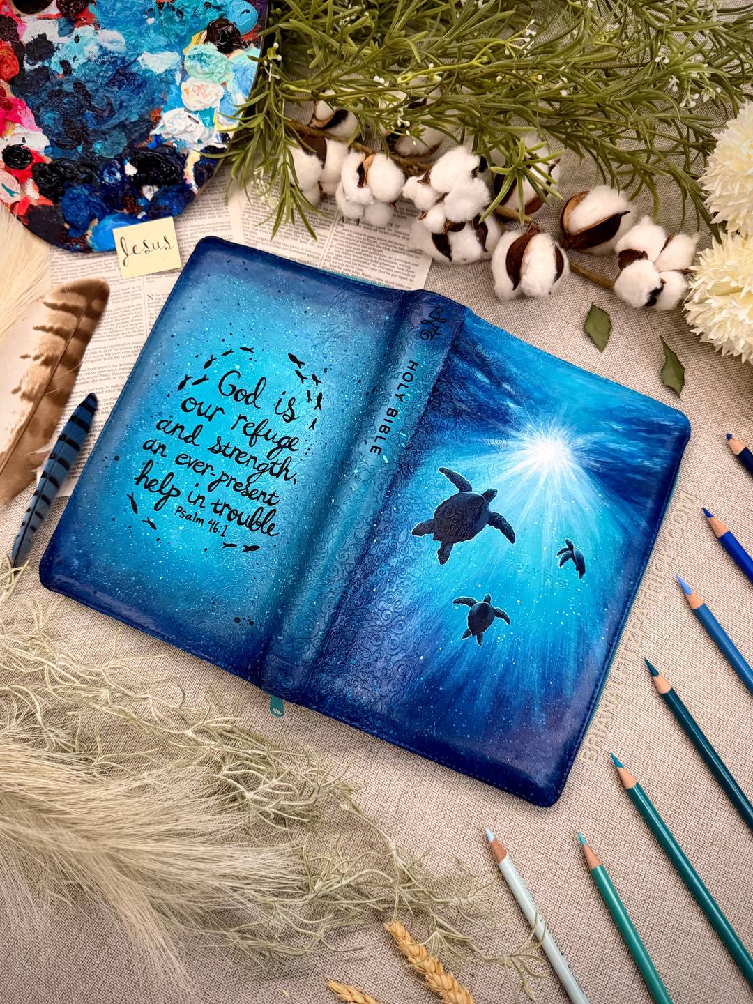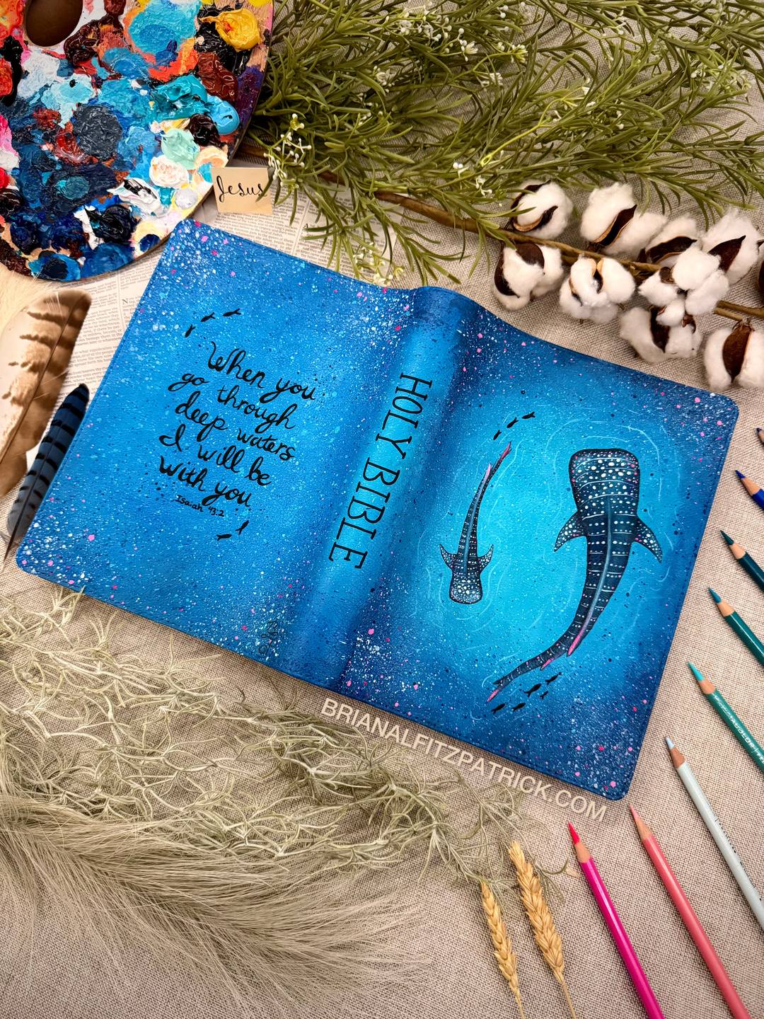 Painting whale sharks on Bibles has been the most popular subject matter as I’ve painted 4 Bibles so far with whale sharks on them 💙